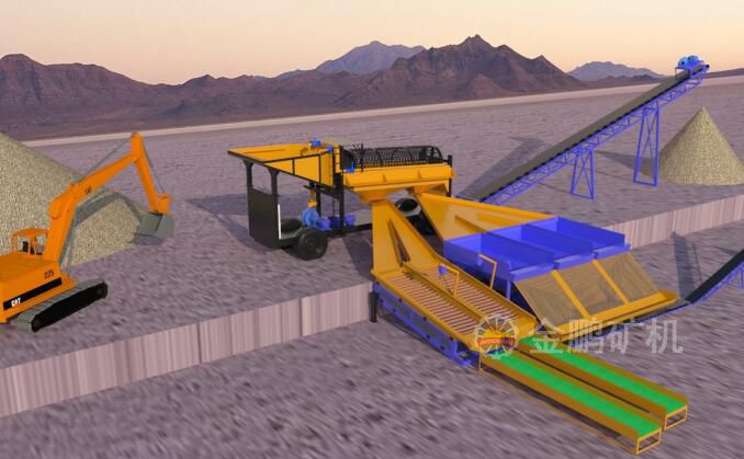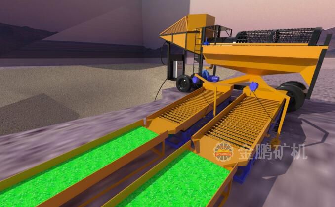 原礦通過(guò)礦用自卸車運(yùn)輸?shù)竭x金車礦倉(cāng),礦倉(cāng)上設(shè)有格篩防止大塊礦石進(jìn)入到分級(jí)洗礦篩對(duì)篩子造成危害,礦石在篩子內(nèi)通過(guò)高壓水的沖洗使礦石、泥土、顆粒金分開(kāi)。篩上產(chǎn)品通過(guò)皮帶運(yùn)輸機(jī)直接運(yùn)輸?shù)綇U料堆廠,篩下產(chǎn)品經(jīng)過(guò)鼓動(dòng)溜槽先進(jìn)行富集,然后再自流至固定溜槽進(jìn)一步回收有價(jià)金,通過(guò)兩次選別作業(yè)顆粒金的回收率可高達(dá)70%以上。我公司生產(chǎn)的移動(dòng)式砂金選礦車解決了原來(lái)固定式運(yùn)輸成本高的弊病更適合旱地選金。