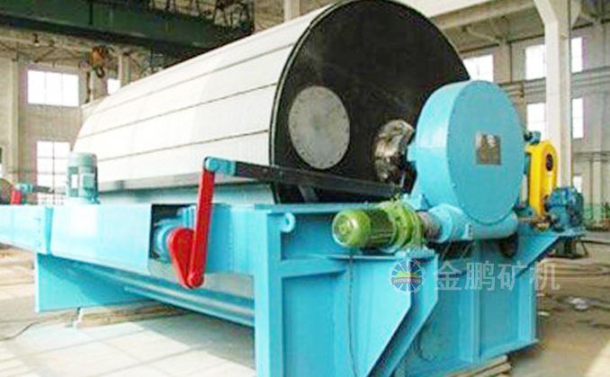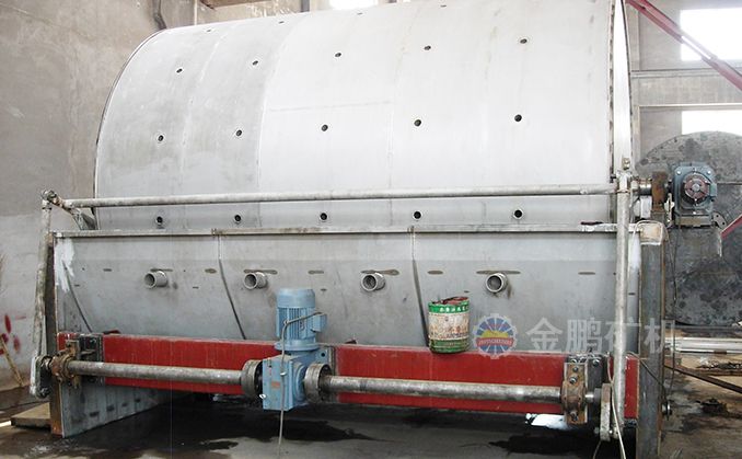 外濾式筒形真空過濾機(jī)主要由筒體、傳動機(jī)構(gòu)、分配頭、主軸承、攪拌器、礦漿槽、刮板和繞線機(jī)構(gòu)等構(gòu)成。