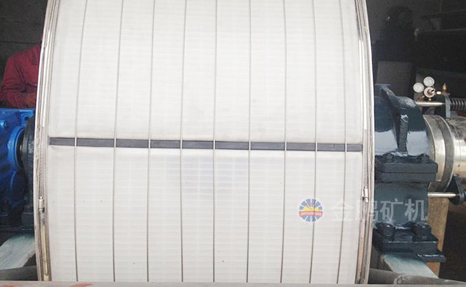 整個筒體外面裹著濾布,為了保證每室之間的密封,濾布用膠條、麻繩或棕繩嵌在隔條的繩槽內(nèi)。然后再用繞線機(jī)構(gòu)在筒體外面沿軸向以50-80mm的間距纏繞很多道鋼絲,把濾布固定在筒體上。