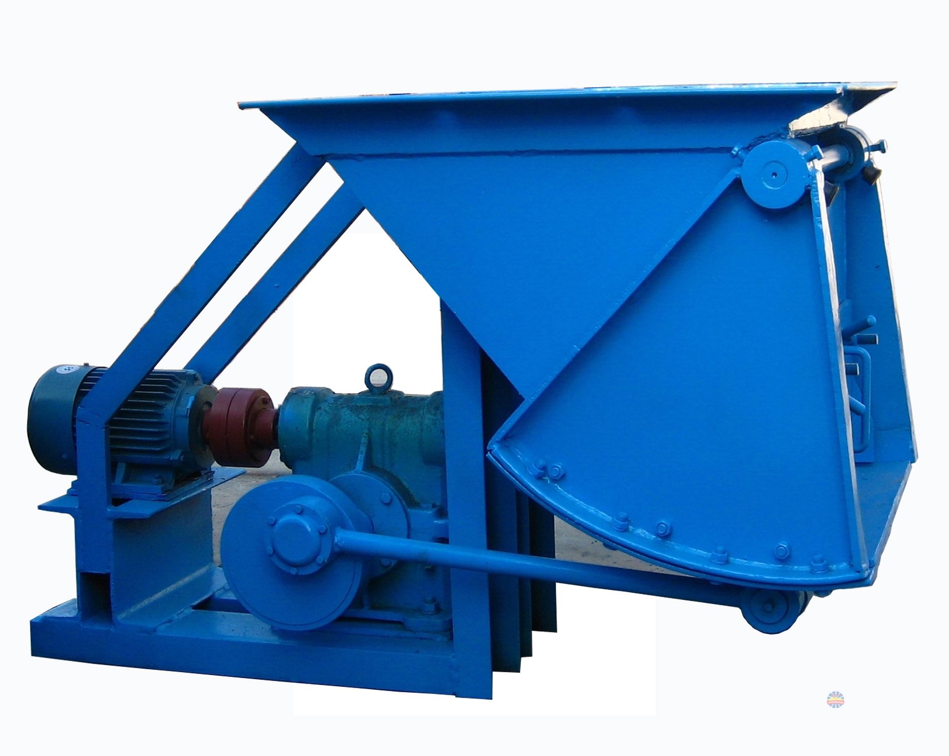 本機是利用偏心輪機構的原理,使顎板做周期的往復運動將物料連續(xù)均勻輸送出去。其原動力是依靠電動機通過渦輪減速器帶動偏心輪,再連桿后把圓周運動變?yōu)橥鶑瓦\動,帶動顎板往復運動。當顎板向順時針方向擺動時使堆積在它上面的物料由于摩擦力而被帶動著一起運動,從存斗器內瀉下一部分新的物料來填充機體內所向外形成的空間,當顎板作反時針方向運動時,由于內部物料的阻擋使物料無法再跟著顎板進入機體內部,因此被推入按設在其下的輸料管或輸送機的接料漏斗中,總之隨著顎板的周期性擺動就能使物料連續(xù)不斷的均勻供料。