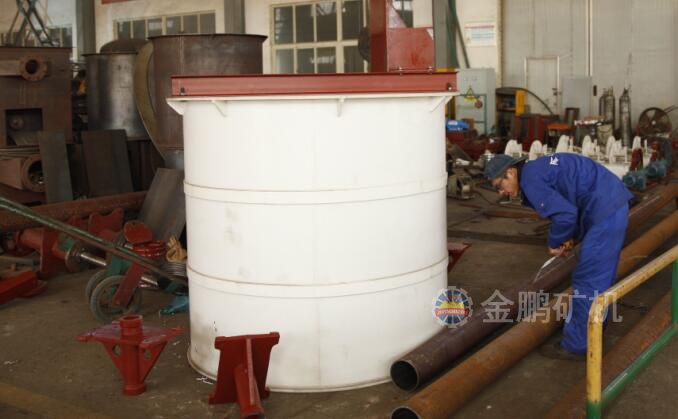 藥用攪拌槽由豎軸部、架子、槽體、小皮帶輪、電動機、電動機座、安全罩等組成。葉輪的旋轉是由電動機通過皮帶輪、三角帶而得到葉輪的旋轉使礦漿和藥劑攪拌均勻。