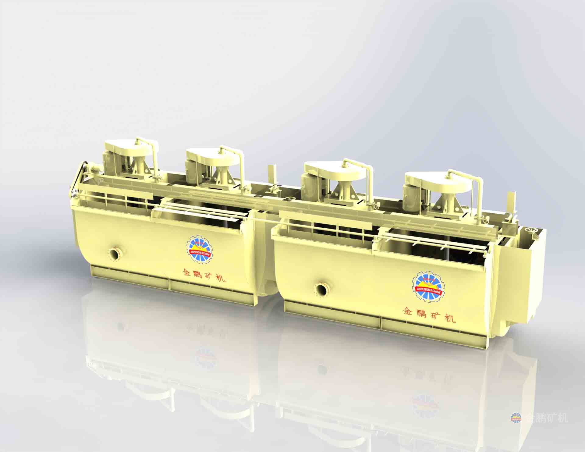 該浮選機(jī)工作時(shí),隨著葉輪的旋轉(zhuǎn),槽內(nèi)礦漿從四周經(jīng)槽底由葉輪下端吸到葉輪葉片之間由鼓風(fēng)機(jī)給入的低壓空氣經(jīng)空心軸和葉輪腔的空氣分配器,也進(jìn)入其中。礦漿與空氣在葉片之間充分混合后,從葉輪上半部周邊向斜上方推出,由定子升穩(wěn)流和定向后進(jìn)入整個(gè)槽子中。氣泡上升到泡沫穩(wěn)定區(qū),礦化富集后,自溢流堰溢出。另一部分礦漿向葉輪下部流去,再經(jīng)攪拌,重新混合形成礦化氣泡。剩余的礦漿流向下一槽直至最終成尾礦。